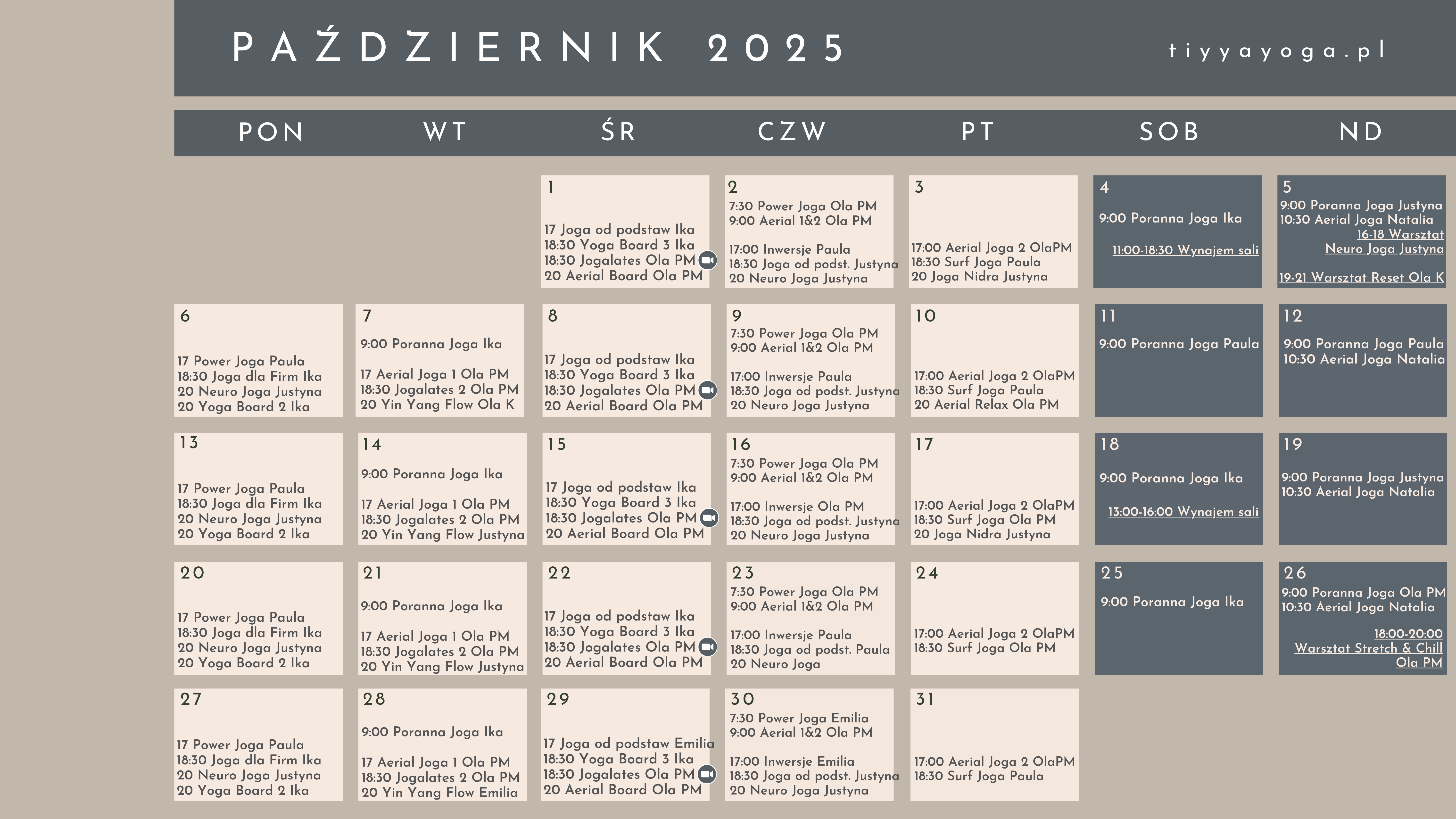 Karnety: • Karnet joga na macie 6 wejść (ważny 8 tygodni): 270 zł / Aerial joga / Yoga Board 6 wejść (ważny 8 tygodni): 330 zł